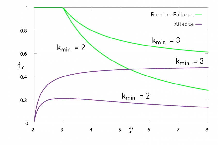 \[f_c = \begin{cases} 1 - \dfrac{1}{\frac{\gamma-2}{3-\gamma} k_{\text{min}} ^{\gamma-2} k_{\text{max}}^{3-\gamma} -1} & \text{if } 2 < \gamma < 3 \\ 1 - \dfrac{1}{\frac{\gamma-2}{\gamma-3} k_{\text{min}} - 1} & \text{if } \gamma > 3 \\ \end{cases}\] $ where \(k_{\text{min}}\) and \(k_{\text{max}}\) are the minimum and maximum degree. (Visualization)
