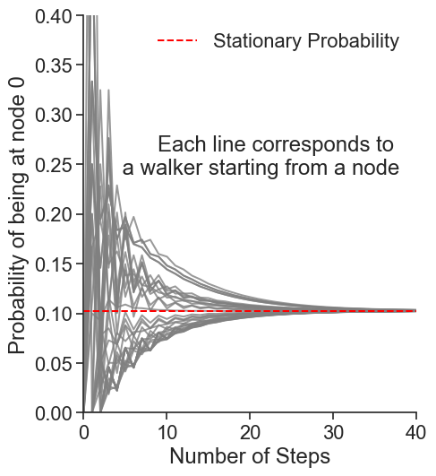 A = g.get_adjacency_sparse() # Get the adjacency matrixTask 1: Create a line plot of the probability distribution of the random walker over the nodes as a function of the number of steps. Create the plot for walkers starting from node 0, 32, or 6.