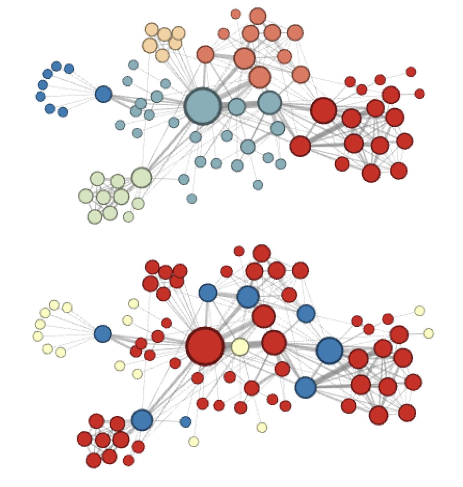 Complementary visualizations of Les Misérables coappearance network generated by node2vec with label colors reflecting homophily (top) and structural equivalence (bottom).
