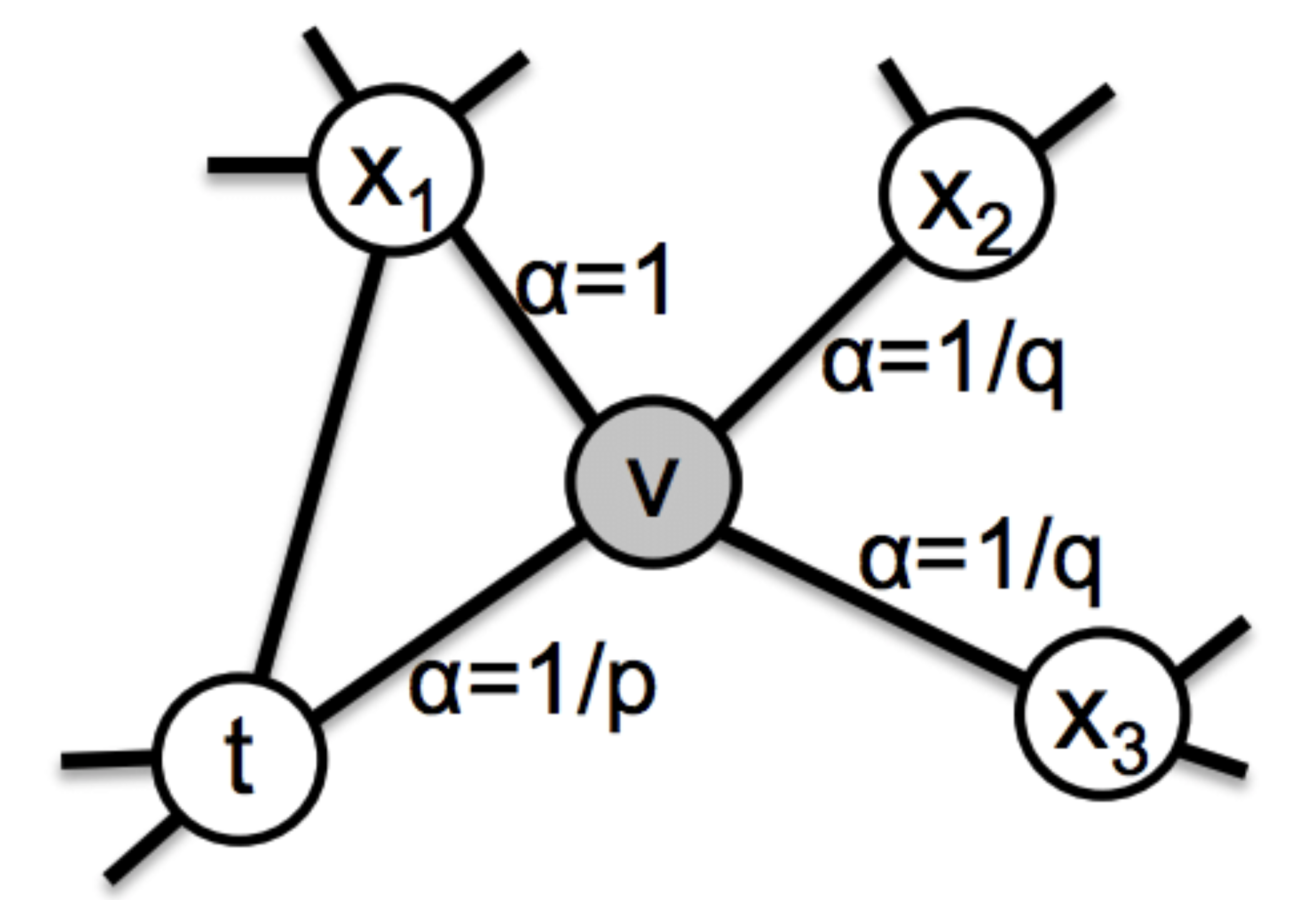 \frac{1}{q} & \text{Move to a neighbor $x_{t+1}$ *not* directly connected to } x_{t-1}