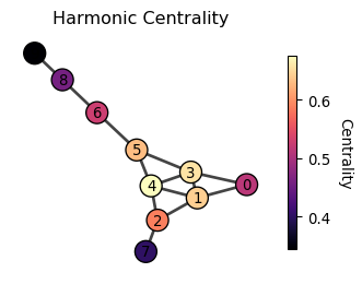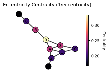 While the closeness and harmonic centralities focus on “average” distance, eccentricity centrality focuses on the farthest distance from a node to any other node. It is defined as