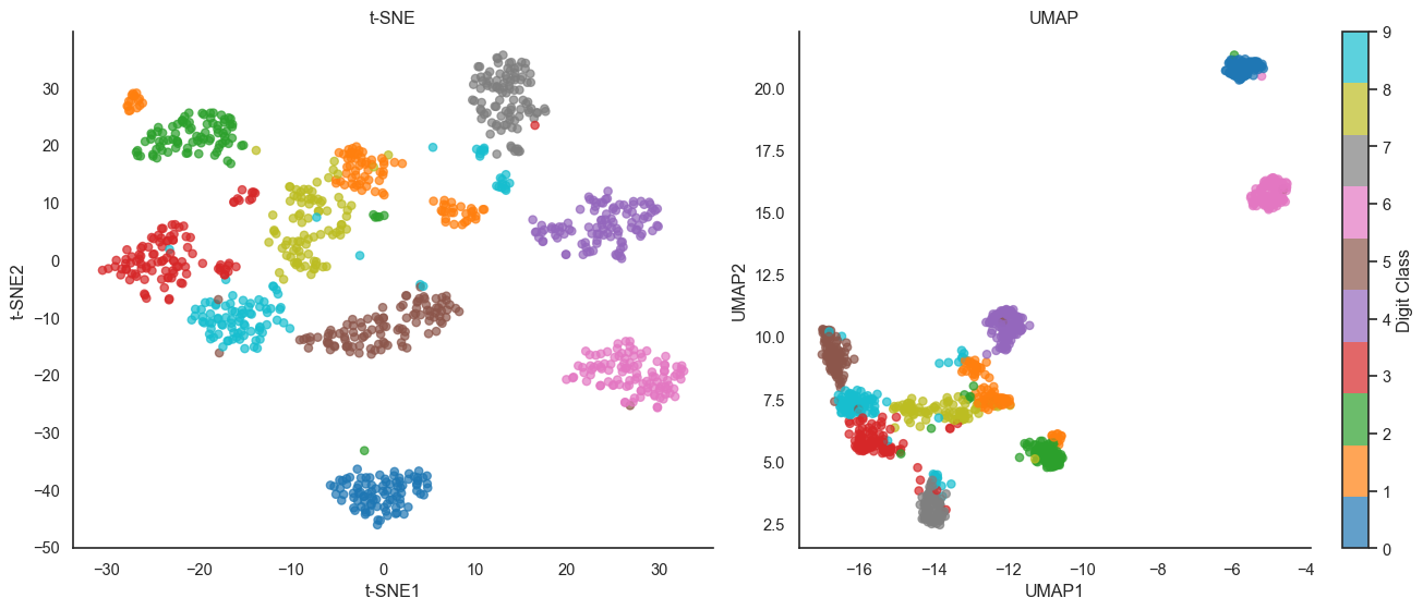 Both methods reveal similar cluster structure, but UMAP tends to space clusters more evenly and preserve more global topology (notice how UMAP places similar digits like 3, 5, 8 in a connected region, suggesting they share underlying structure).