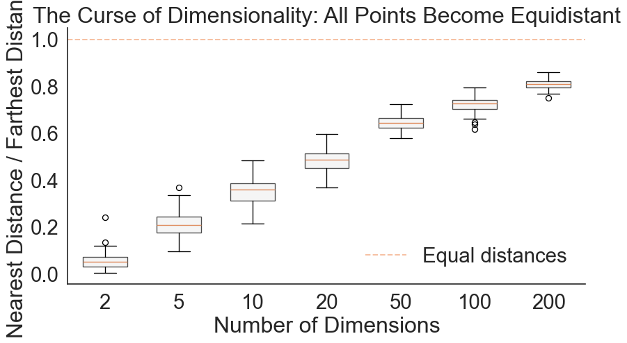 import numpy as npimport matplotlib.pyplot as pltimport seaborn as snsimport pandas as pdfrom sklearn.metrics.pairwise import euclidean_distancessns.set_style("white")np.random.seed(42)# Calculate distance ratio across dimensionsdimensions = [2, 5, 10, 20, 50, 100, 200]n_samples =100ratios = []for d in dimensions:# Generate random data X = np.random.randn(n_samples, d)# Calculate all pairwise distances distances = euclidean_distances(X)# For each point, find nearest and farthest (excluding self) np.fill_diagonal(distances, np.inf) # Ignore self-distance nearest = distances.min(axis=1)# For "farthest," ignore inf (self-distance), so set inf entries to -1 and use argmax temp = distances.copy() temp[temp == np.inf] =-1# Now maximum is truly among finite values farthest = temp.max(axis=1)# Calculate ratio ratio = nearest / farthest ratios.append(ratio)# Plotsns.set(font_scale=2.0)sns.set_style("white")blue, red = sns.color_palette('muted', 2)fig, ax = plt.subplots(figsize=(10, 5))positions =range(len(dimensions))bp = ax.boxplot(ratios, positions=positions, widths=0.6, patch_artist=True, boxprops=dict(facecolor="#f2f2f2", alpha=0.7))ax.set_xticklabels(dimensions)ax.set_xlabel('Number of Dimensions')ax.set_ylabel('Nearest Distance / Farthest Distance')ax.set_title('The Curse of Dimensionality: All Points Become Equidistant')ax.axhline(y=1.0, color=red, linestyle='--', alpha=0.5, label='Equal distances')ax.legend(frameon=False)sns.despine()