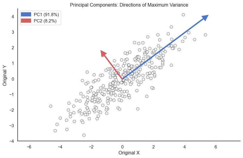 from sklearn.decomposition import PCA# Generate correlated 2D data (for visualization)np.random.seed(123)mean = [0, 0]cov = [[3, 2], [2, 2]]data_2d = np.random.multivariate_normal(mean, cov, 300)# Fit PCApca = PCA(n_components=2)pca.fit(data_2d)colors = ["#f2f2f2", sns.color_palette('muted')[0], sns.color_palette('muted')[3]]# Plot original data with principal componentsfig, ax = plt.subplots(figsize=(10, 6))ax.scatter(data_2d[:, 0], data_2d[:, 1], alpha=0.9, s=50, color=colors[0], edgecolors='k', linewidth=0.5)# Draw principal components as arrowsorigin = pca.mean_for i, (component, variance) inenumerate(zip(pca.components_, pca.explained_variance_)): direction = component * np.sqrt(variance) *3# Scale for visibility ax.arrow(origin[0], origin[1], direction[0], direction[1], head_width=0.3, head_length=0.3, fc=colors[i+1], ec=colors[i+1], linewidth=3, label=f'PC{i+1} ({variance/pca.explained_variance_.sum()*100:.1f}%)')ax.set_xlabel('Original X')ax.set_ylabel('Original Y')ax.set_title('Principal Components: Directions of Maximum Variance')ax.legend()ax.axis('equal')sns.despine()