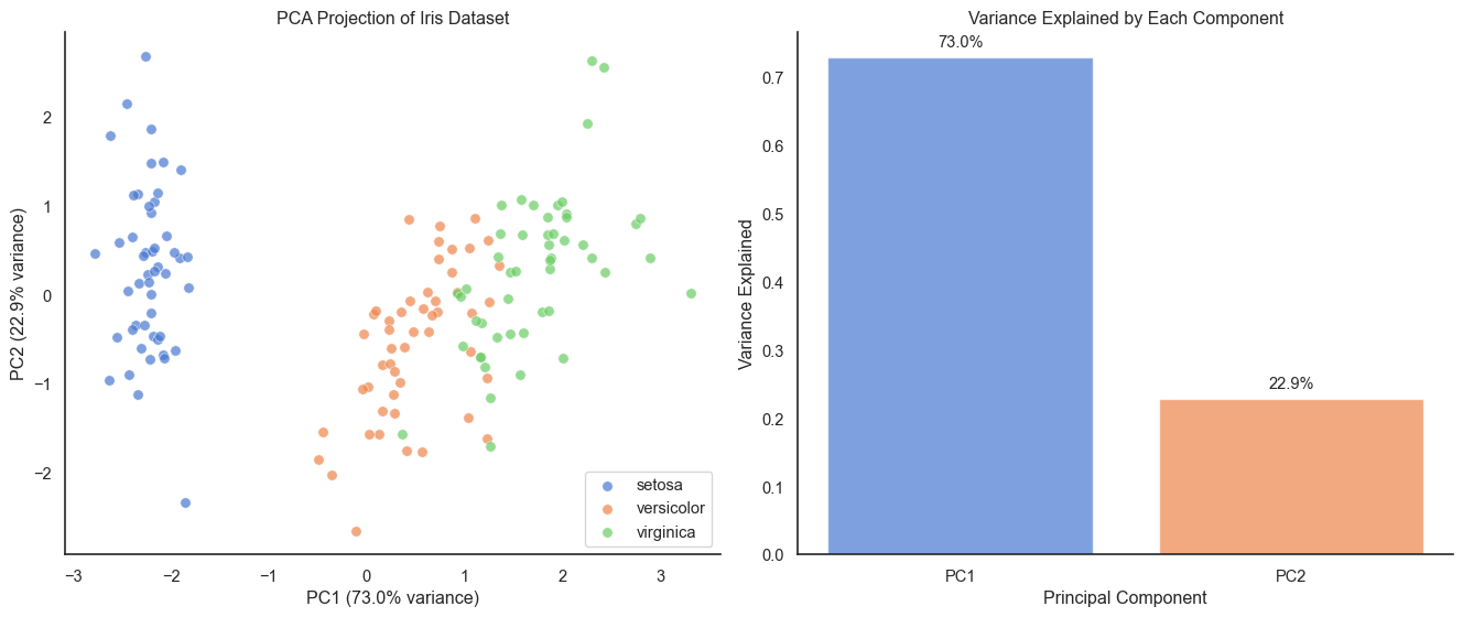 Let’s apply PCA to the 4-dimensional Iris dataset and see how much information we can preserve in just 2 dimensions.