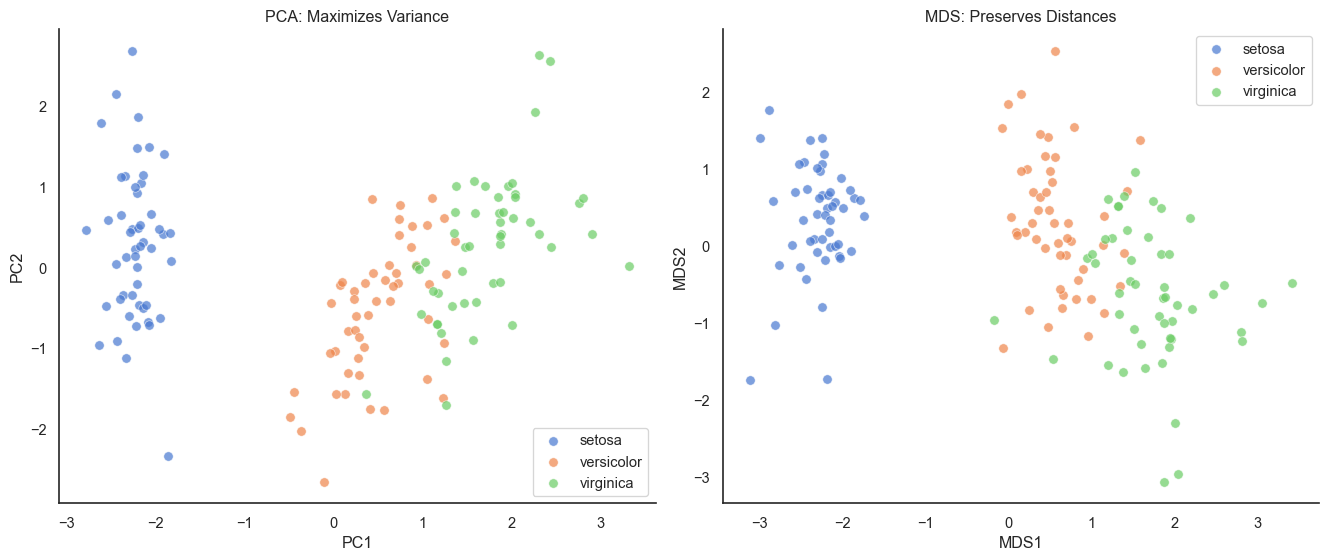 For the Iris dataset, PCA and MDS look very similar. This is because Iris data is fairly linear. The relationships between features don’t involve complex curves or non-linear structures that would cause MDS to differ significantly from PCA.