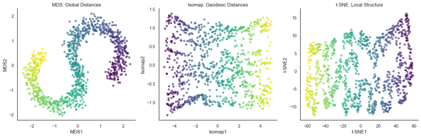 from sklearn.manifold import TSNE# Apply t-SNEtsne = TSNE(n_components=2, random_state=42, perplexity=30)X_scurve_tsne = tsne.fit_transform(X_scurve)# Plot all three methodsfig, axes = plt.subplots(1, 3, figsize=(15, 5))# MDS - Global Euclidean distancesaxes[0].scatter(X_scurve_mds[:, 0], X_scurve_mds[:, 1], c=color, cmap='viridis', alpha=0.6, s=20)axes[0].set_xlabel('MDS1')axes[0].set_ylabel('MDS2')axes[0].set_title('MDS: Global Distances')sns.despine(ax=axes[0])# Isomap - Geodesic distancesaxes[1].scatter(X_scurve_isomap[:, 0], X_scurve_isomap[:, 1], c=color, cmap='viridis', alpha=0.6, s=20)axes[1].set_xlabel('Isomap1')axes[1].set_ylabel('Isomap2')axes[1].set_title('Isomap: Geodesic Distances')sns.despine(ax=axes[1])# t-SNE - Local neighborhoodsaxes[2].scatter(X_scurve_tsne[:, 0], X_scurve_tsne[:, 1], c=color, cmap='viridis', alpha=0.6, s=20)axes[2].set_xlabel('t-SNE1')axes[2].set_ylabel('t-SNE2')axes[2].set_title('t-SNE: Local Structure')sns.despine(ax=axes[2])plt.tight_layout()