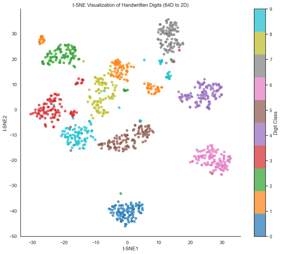 from sklearn.datasets import load_digits# Load digits dataset (8x8 images, 64 dimensions)digits = load_digits()X_digits = digits.datay_digits = digits.target# Take a subset for speed (t-SNE is slow on large datasets)np.random.seed(42)indices = np.random.choice(len(X_digits), size=1000, replace=False)X_subset = X_digits[indices]y_subset = y_digits[indices]# Apply t-SNEtsne_digits = TSNE(n_components=2, random_state=42, perplexity=40)X_digits_tsne = tsne_digits.fit_transform(X_subset)# Plotfig, ax = plt.subplots(figsize=(12, 10))scatter = ax.scatter(X_digits_tsne[:, 0], X_digits_tsne[:, 1], c=y_subset, cmap='tab10', alpha=0.7, s=30)ax.set_xlabel('t-SNE1')ax.set_ylabel('t-SNE2')ax.set_title('t-SNE Visualization of Handwritten Digits (64D to 2D)')cbar = plt.colorbar(scatter, ax=ax, ticks=range(10))cbar.set_label('Digit Class')sns.despine()