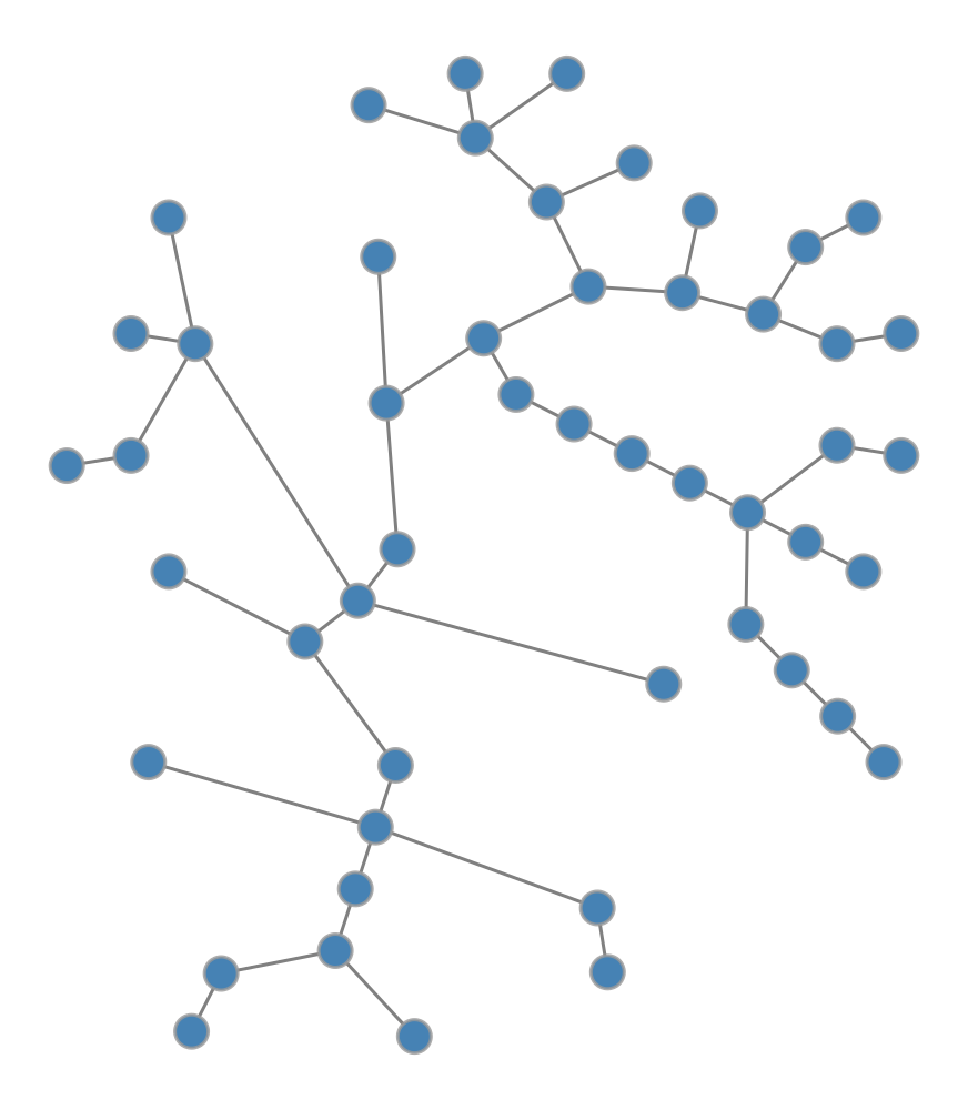 import graph_tool.allas gtimport networkx as nximport numpy as npimport matplotlib.pyplot as plt# Set random seed for reproducibilitynp.random.seed(42)# Generate a random tree using NetworkXnx_tree = nx.random_labeled_tree(n=50, seed=42)# Convert to graph-toolg = gt.Graph(directed=False)g.add_vertex(nx_tree.number_of_nodes())for u, v in nx_tree.edges(): g.add_edge(g.vertex(u), g.vertex(v))# Create radial tree layoutpos = gt.radial_tree_layout(g, g.vertex(0))# Draw the network (let graph-tool handle rendering directly)gt.graph_draw(g, pos=pos, vertex_fill_color=[0.275, 0.510, 0.706, 1], # steelblue vertex_size=15, edge_color=[0.5, 0.5, 0.5, 1], # gray edge_pen_width=1.5, output_size=(500, 500), inline=True)