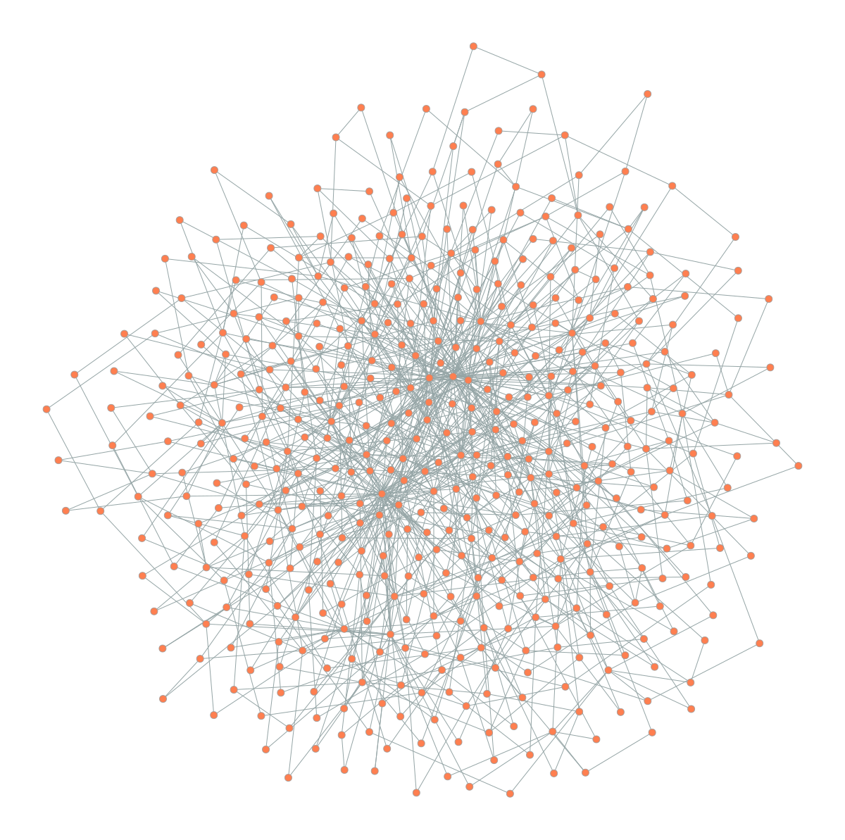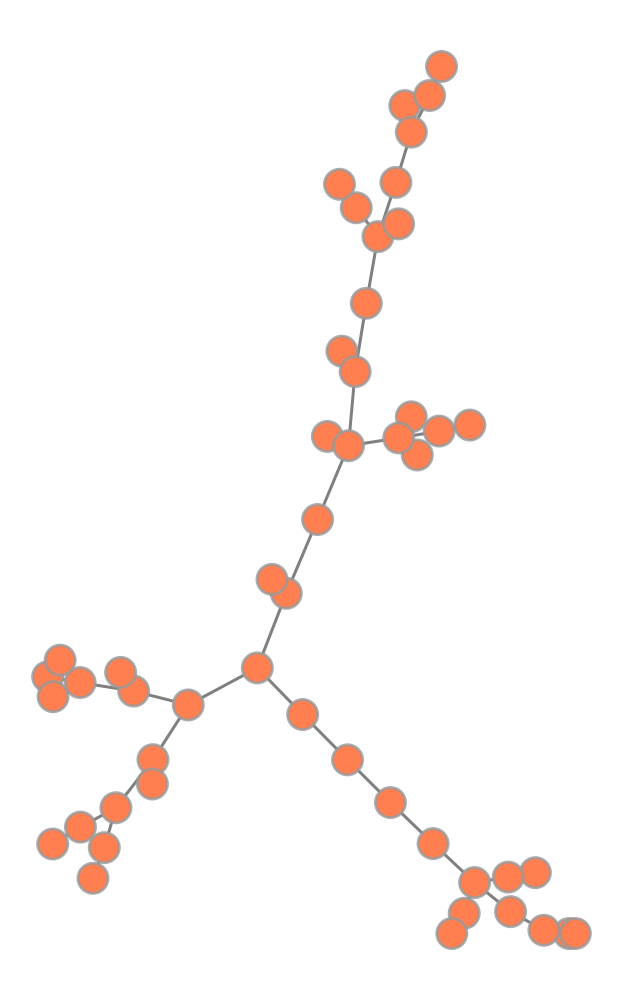 import graph_tool.allas gtimport networkx as nximport numpy as npnp.random.seed(42)# Generate a random tree using NetworkXnx_tree = nx.random_labeled_tree(n=50, seed=42)# Convert to graph-toolg = gt.Graph(directed=False)g.add_vertex(nx_tree.number_of_nodes())for u, v in nx_tree.edges(): g.add_edge(g.vertex(u), g.vertex(v))# Force-directed layout (Fruchterman-Reingold)pos_force = gt.fruchterman_reingold_layout(g, n_iter=1000)# Draw force-directed layout inlinegt.graph_draw( g, pos=pos_force, vertex_fill_color=[1.0, 0.498, 0.314, 1], # coral vertex_size=15, edge_color=[0.5, 0.5, 0.5, 1], # gray edge_pen_width=1.5, output_size=(500, 500), inline=True)