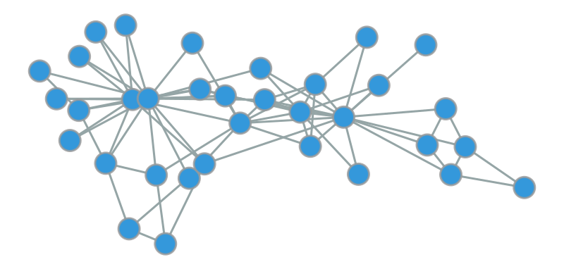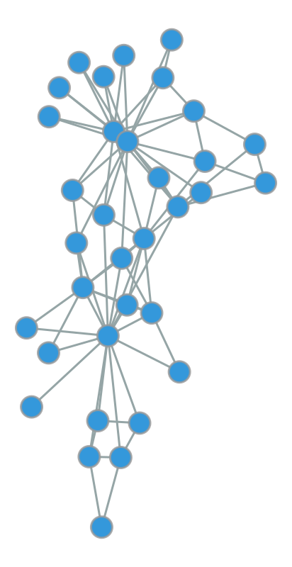 import graph_tool.allas gtimport numpy as npimport matplotlib.pyplot as plt# Load the karate club networkg = gt.collection.data["karate"]# Get community labels (the two groups that split)# We'll use blockmodel inference with 2 communitiesstate = gt.minimize_blockmodel_dl(g, state_args=dict(B=2))community = state.get_blocks()# Create Fruchterman-Reingold layoutpos = gt.fruchterman_reingold_layout(g, n_iter=1000)# Map communities to colors (RGB tuples)color_map = {0: [0.906, 0.298, 0.235, 1], # Red1: [0.204, 0.596, 0.859, 1]} # Blue# Create vertex property map for colorsvertex_color = g.new_vertex_property("vector<double>")for v in g.vertices(): vertex_color[v] = color_map[community[v]]# Draw the networkgt.graph_draw(g, pos=pos, vertex_fill_color=vertex_color, vertex_size=20, edge_color=[0.584, 0.647, 0.651, 1], edge_pen_width=2, output_size=(1000, 800), inline=True)
