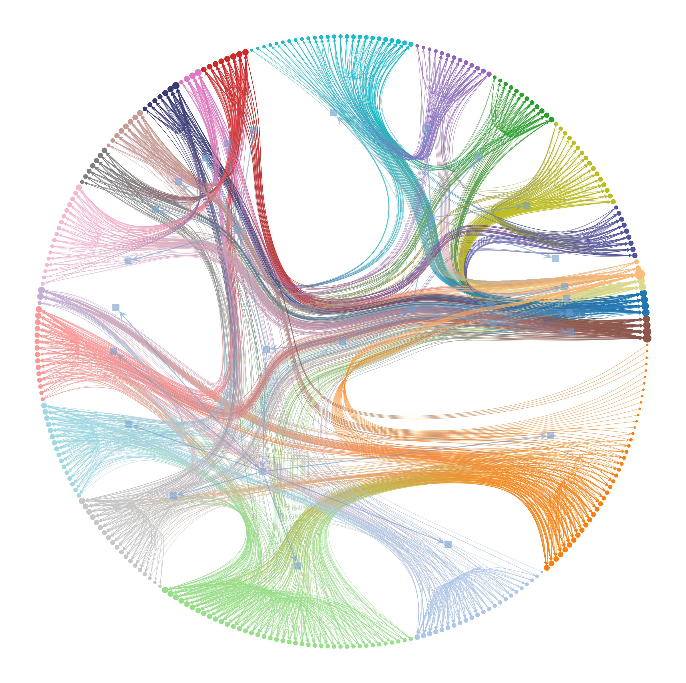 Without edge bundling, this network would look like an incomprehensible hairball. With it, we can see that most connections occur within communities or between closely related ones. This is exactly what we expect in a modular biological system.