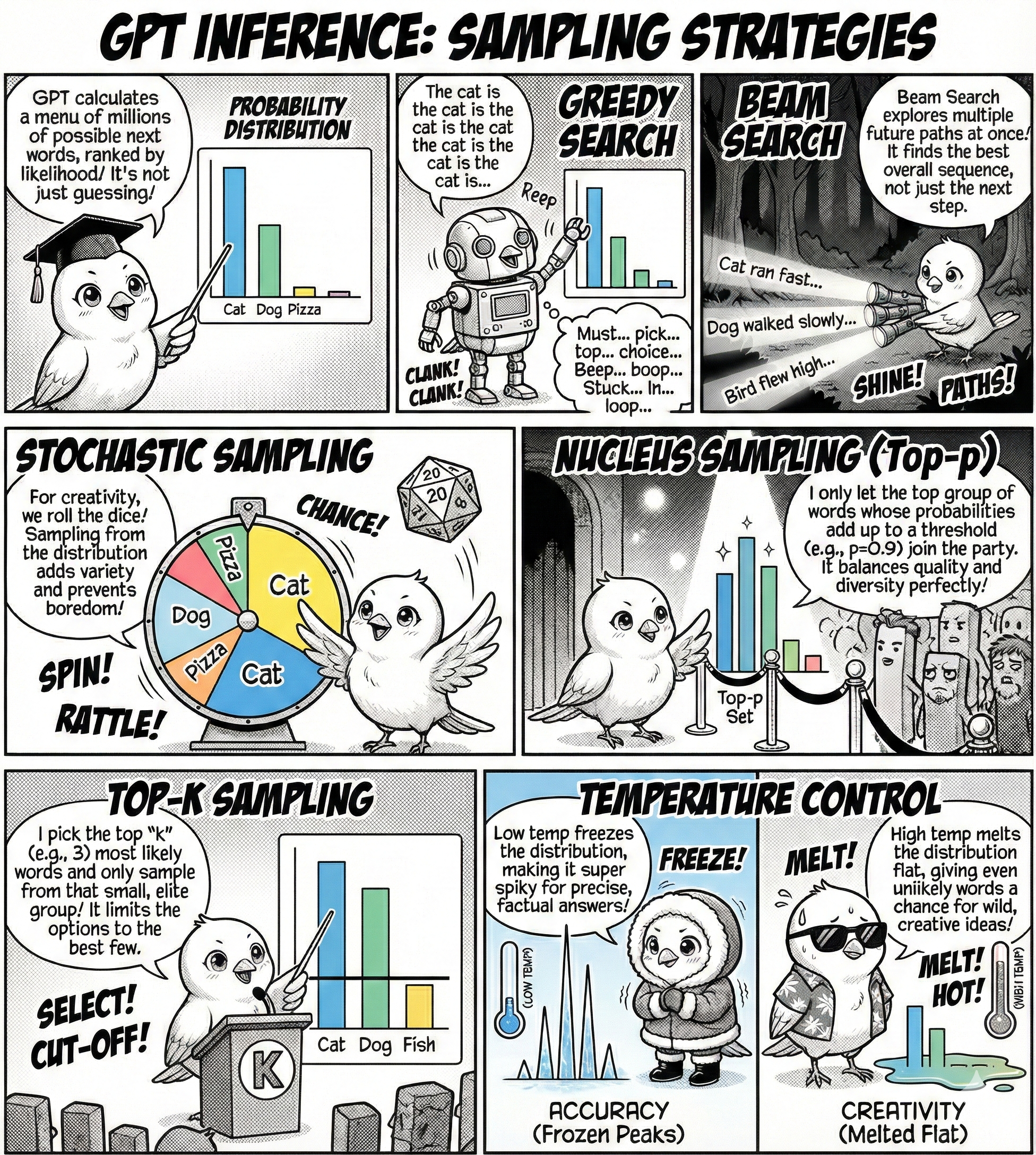 GPT generates text one token at a time, repeatedly sampling from the probability distribution. Let’s examine the strategies for sampling that balance quality and diversity.