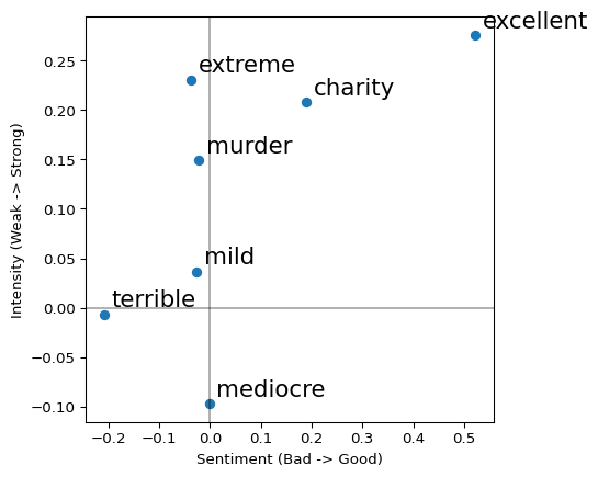 - How to project words onto axes to measure alignment with concepts like sentiment or intensity.