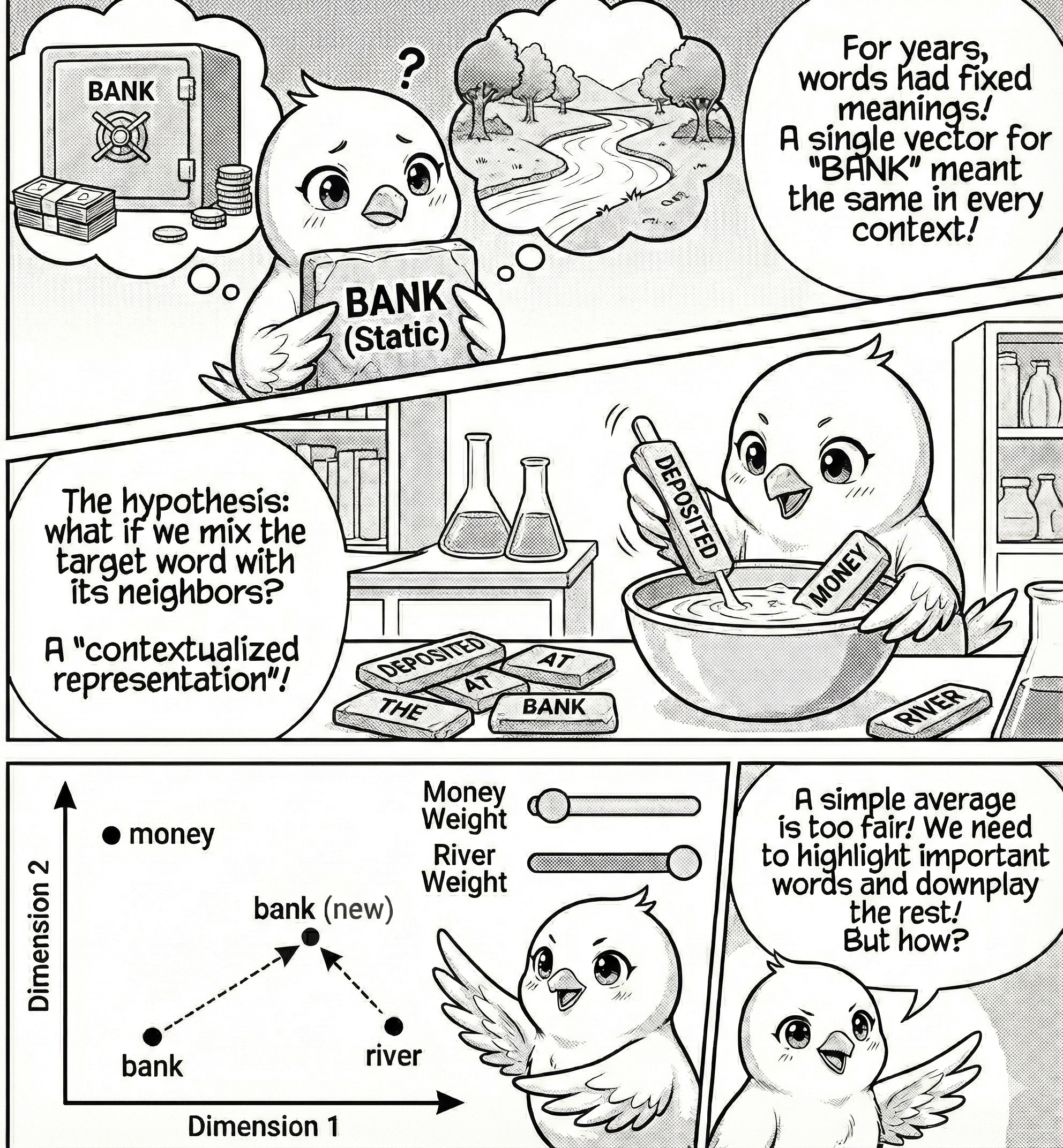 For many years, natural language processing treated words as having fixed meanings. Each word (like “bank”) received a single vector of numbers, called a static embedding. But there’s a hidden catch in this “one meaning per word” mindset: with just a single fixed entry in the dictionary, “bank” means exactly the same thing in “I deposited money at the bank” as in “We had a picnic by the bank”. Think of it like describing a population by its average height and pretending nobody’s shorter or taller, where every possible meaning gets mashed into a one-size-fits-all average and the interesting details vanish in the mix.