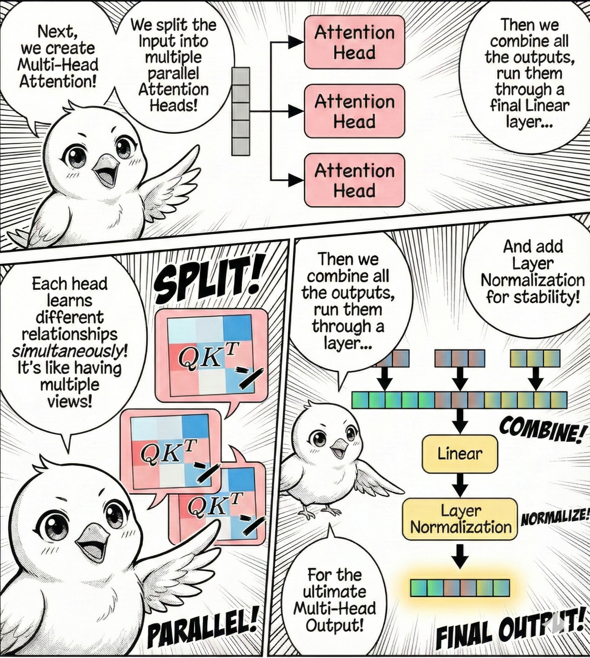 \text{Output} = \text{Linear}(\text{Concat}(\text{head}_1, \text{head}_2, \ldots, \text{head}_h))