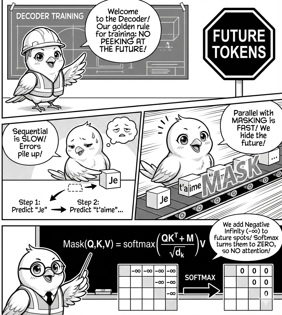 How do we implement the masking? We set the attention scores to negative infinity for future tokens before the softmax operation, effectively zeroing out their contribution: