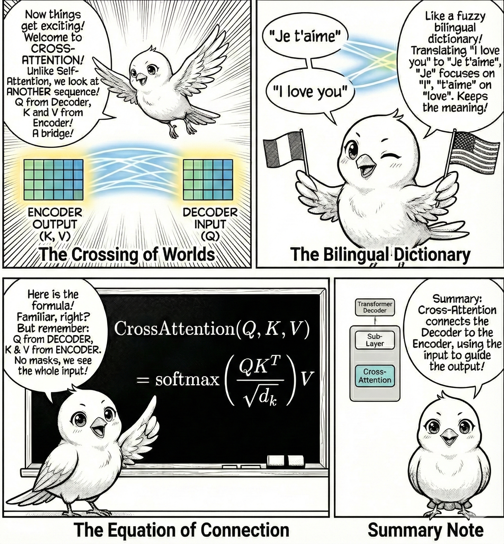 Cross-attention occurs when the Query comes from one sequence (like a sentence being generated) and the Keys and Values come from another sequence (like the input sentence you want to translate). Here, the model learns to align information from input to output, a sort of bilingual dictionary lookup, but learned and fuzzy.