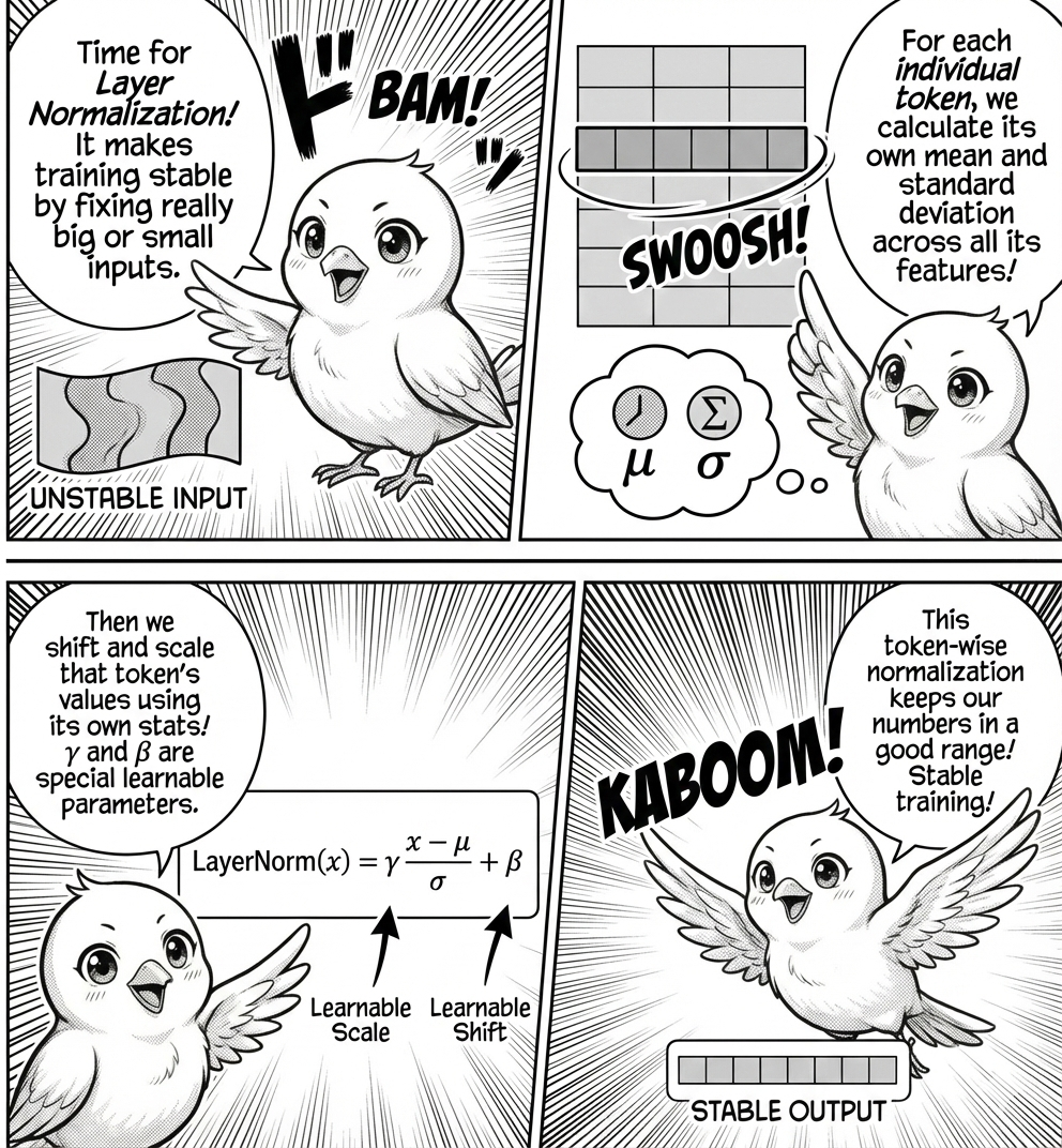 Note that layer normalization is applied to individual tokens: the normalization is token-wise rather than feature-wise, with mean and standard deviation calculated for each token across all feature dimensions. This differs from feature-wise normalization, where mean and standard deviation are calculated for each feature across all tokens.