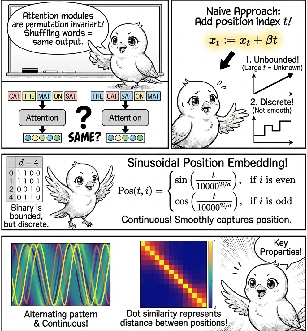 Why additive position embedding? Sinusoidal position embedding is additive, altering the token embedding. Alternatively, one might concatenate the position embedding to the token embedding: x_{t,i} := [x_{t,i}; \text{Pos}(t, i)], which makes it easier for a model to distinguish position from token information. So why not use concatenation? Concatenation requires a larger embedding dimension, increasing the number of parameters. Instead, adding the position embedding creates an interesting effect in the attention mechanism (interested readers can check out this Reddit post).