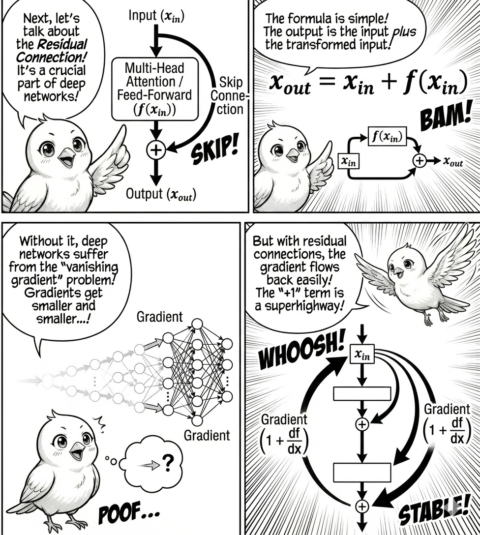 Another important component is the residual connection. The input is first passed through multi-head attention, followed by layer normalization. Notice the parallel path from input to the output of the attention module, called a residual connection (or skip connection), a technique used to stabilize the training of deep neural networks by mitigating the problem of too large or too small input values that can cause network instability.