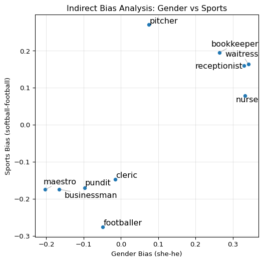 ax.set_title("Indirect Bias Analysis: Gender vs Sports")