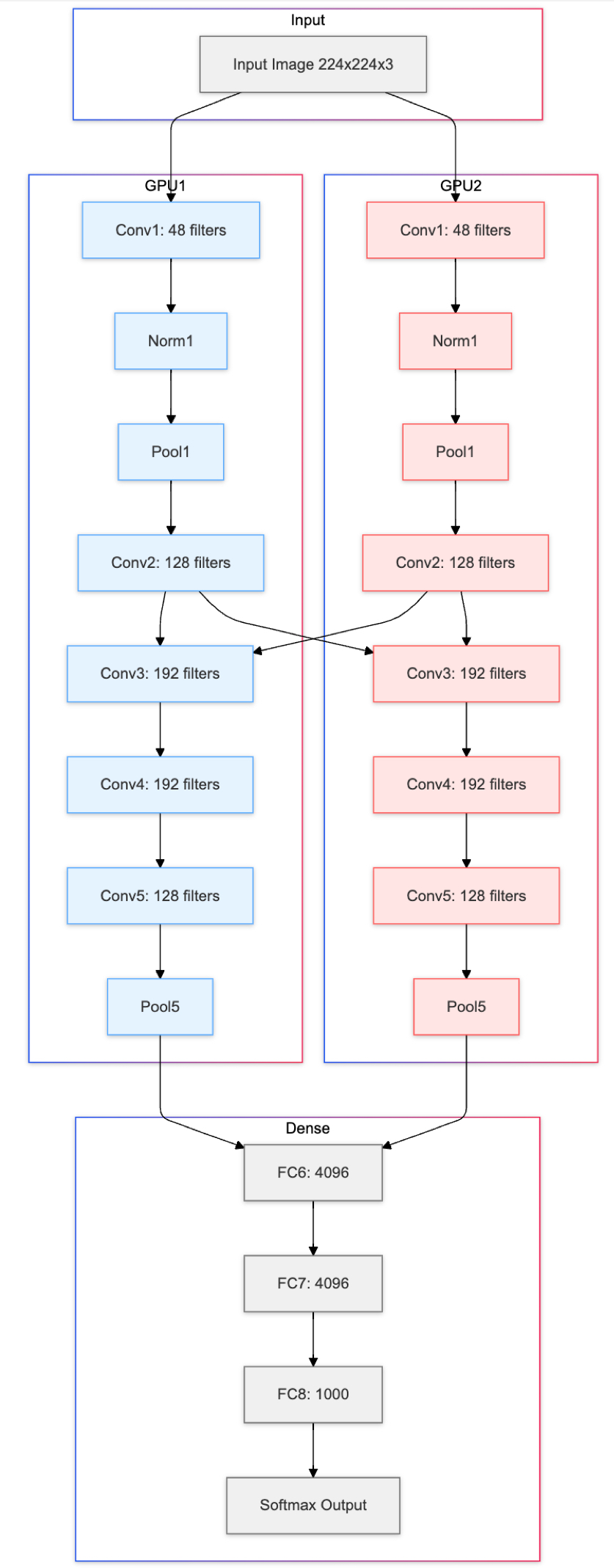 AlexNet demonstrated that deep learning needed massive computational power. The network was trained on two GPUs with 3GB memory each, splitting the computation to handle the large parameter count. This wasn’t just an implementation detail—it showed that deep learning required specialized hardware and helped catalyze the GPU computing revolution that continues today, with modern networks training on dozens or hundreds of GPUs.