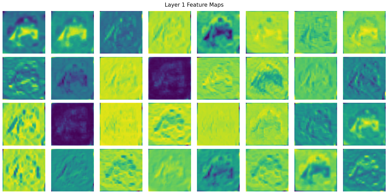 Early layers show edge detection and simple patterns, while deeper layers show increasingly abstract features that are harder to interpret but encode high-level semantic information.