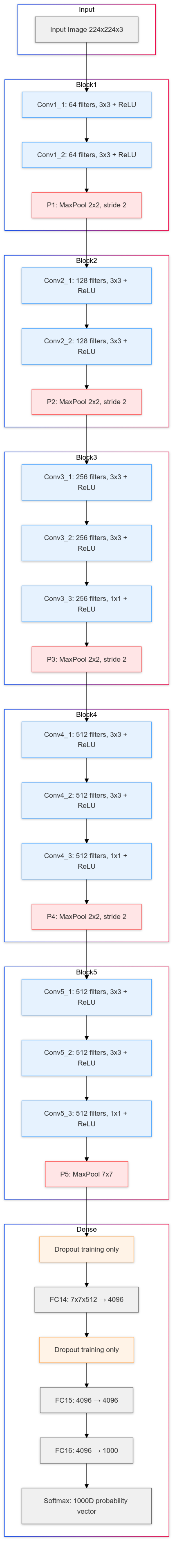 VGGNet demonstrated that systematic depth works (Simonyan and Zisserman 2014). The key insight was using small 3×3 convolutions exclusively, stacked together to build deep networks.