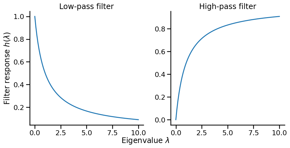 Eigenvalues act as natural filters. We can design custom filters h(\lambda_i) to control which frequencies pass through. Let’s look at two fundamental filters.