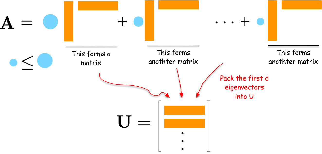 The solution is the d eigenvectors corresponding to the smallest eigenvalues of {\bf L} (excluding the trivial zero eigenvalue). The smallest eigenvalue is always zero with eigenvector of all ones. In practice, compute d+1 smallest eigenvectors and discard the first.
