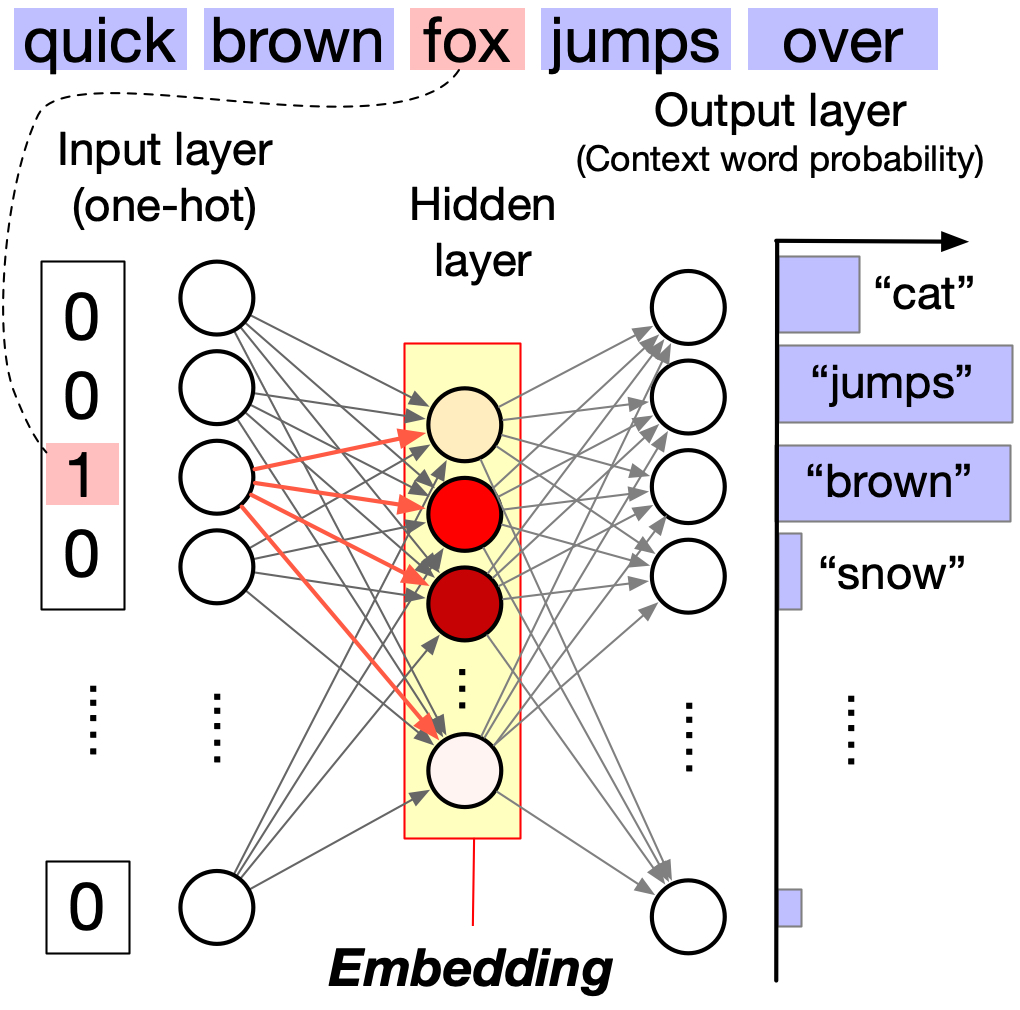 The hidden layer activations become dense, low-dimensional vectors capturing semantic relationships. For a visual walkthrough, see The Illustrated Word2vec by Jay Alammar.