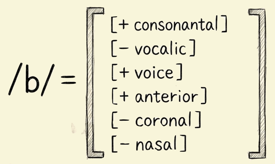 Jakobson’s insight was that you could decompose any phoneme into a bundle of binary features. Consider the phoneme /b/ (as in “baby”): it’s articulated [+labial] (at the lips), the vocal cords vibrate [+voiced], air doesn’t flow through the nose [-nasal], and airflow is stopped by [+stop] (complete closure, then release). The phoneme /b/ isn’t a primitive unit but a coordinate in feature space: [+labial, +voiced, -nasal, +stop, -continuant]. Change one feature and you get a different phoneme: flip [+voiced] to [-voiced] and you get /p/, or flip [+stop] to [-stop, +continuant] and you get /v/.