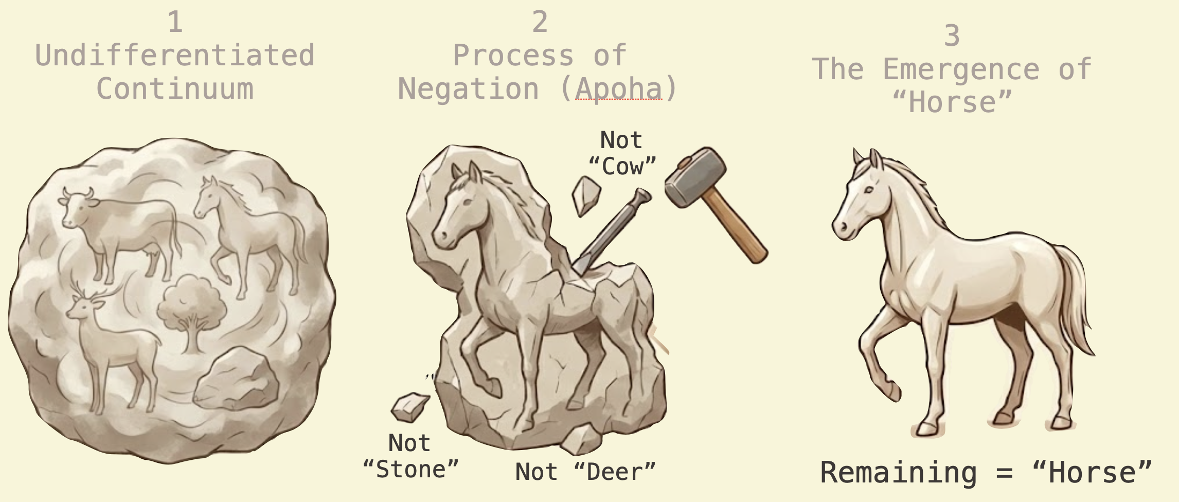 This idea that concepts are defined through negation has deep roots. Buddhist philosophers in ancient India developed a theory called Apoha (literally “exclusion”) around the 5th century CE. They argued that we cannot understand what a thing is, only what it is not.