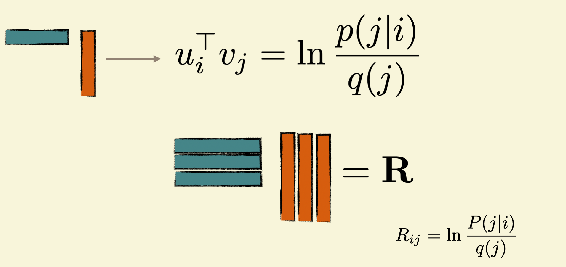 \begin{align} \mathbf{R} &= \log p(i,j) - \log q(j) \\ \mathbf{U} &= \begin{bmatrix} u_1 \\ u_2 \\ \vdots \\ u_{|\mathcal{V}|} \end{bmatrix}, \mathbf{V} &= \begin{bmatrix} v_1 \\ v_2 \\ \vdots \\ v_{|\mathcal{V}|} \end{bmatrix} \end{align}