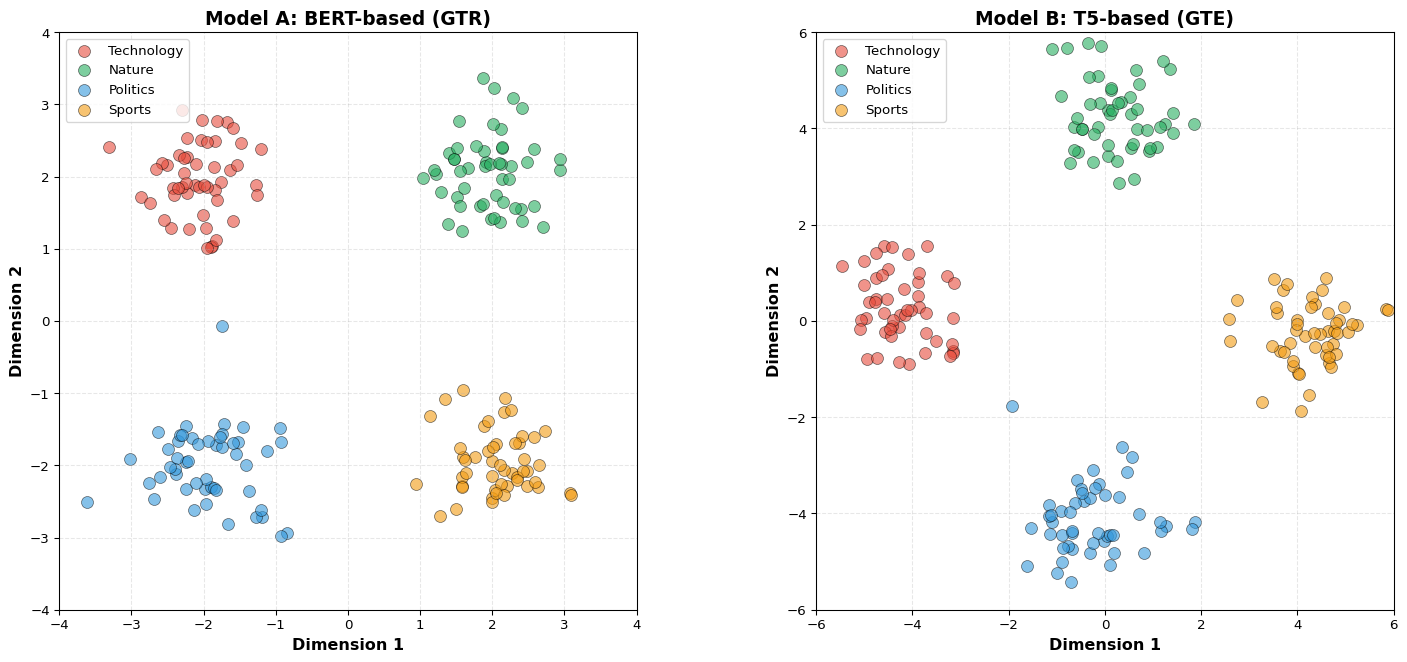 Let’s start with a practical question that reveals something profound. Suppose you have two different text embedding models, each trained independently on different datasets, using different architectures. Model A might be based on BERT (bidirectional transformer) while Model B might use T5 (encoder-decoder architecture), with different numbers of parameters, different training corpora (Wikipedia versus web crawl data), and different embedding dimensions (768-d versus 1024-d).